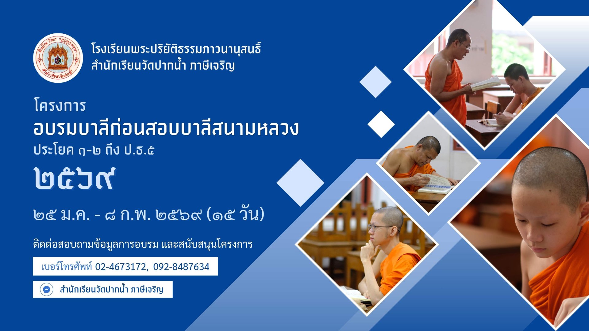 หรือติดต่อผ่านช่องทางอินบ็อกเพจ สำนักเรียนวัดปากน้ำ ภาษีเจริญ