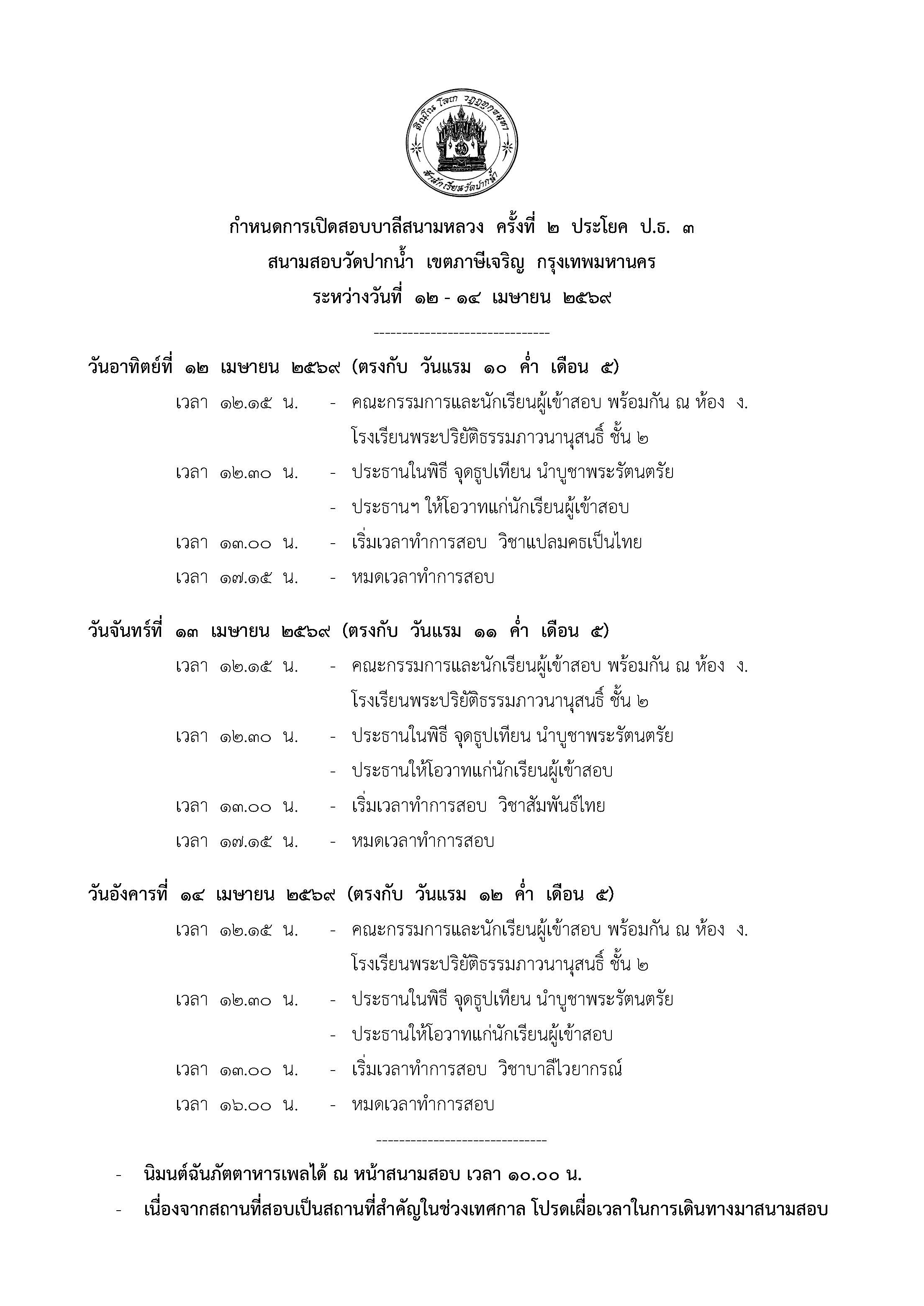 - นิมนต์ผู้เข้าสอบทุกรูปฉันภัตตาหารเพลได้ ณ หน้าสนามสอบ เวลา ๑๐.๐๐ น.